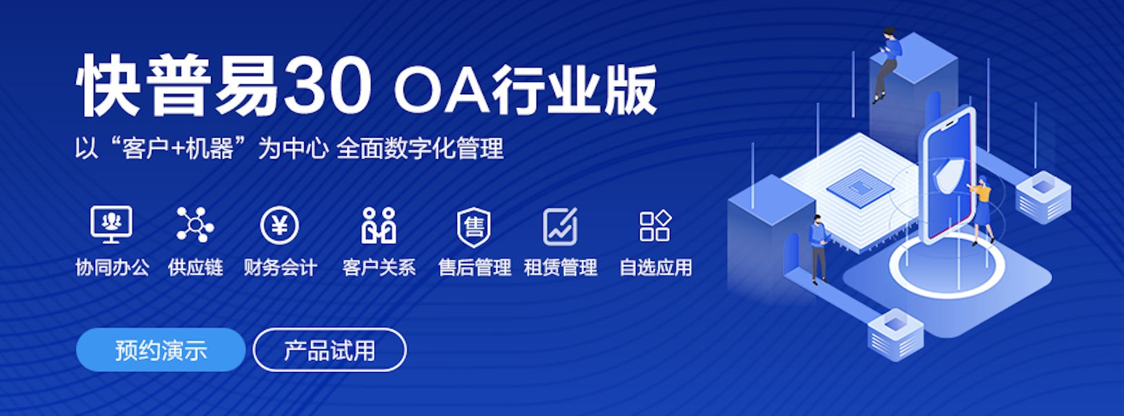 快普易30基于快普近20年在全國上萬家OA企業(yè)的實施與服務(wù)經(jīng)驗,融合了行業(yè)成功的管理智慧,以“客戶+機(jī)器”為中心提供數(shù)字化轉(zhuǎn)型解決方案,全面解決銷售、服務(wù)、租賃等多種業(yè)務(wù)模式的管理需求,以及企業(yè)經(jīng)營核算分析。